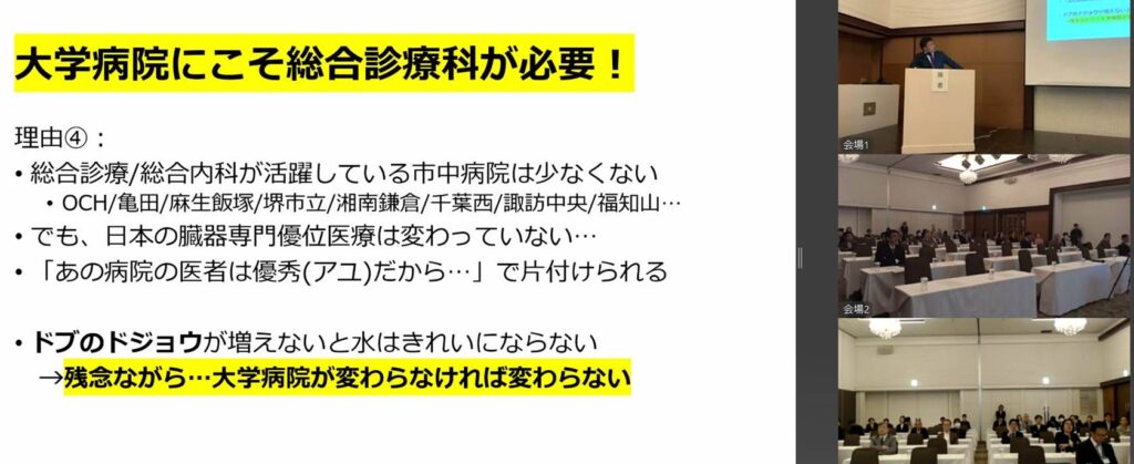繁田知之先生はパネルディスカッション「大学病院における総合内科・総合診療科の在り方」のトップバッターとして地域に根差した大学病院における総合診療医の役割」というタイトルで当科の取り組みについて紹介してくれました。当科は外来・入院とも全国トップクラスの患者数であり、数多くの患者さんを診療する多忙な環境の中で研究と教育にも取り組んでいる姿勢が多くの先生方の印象に残ったようで、多くの先生からコメントをいただけたとのことです。