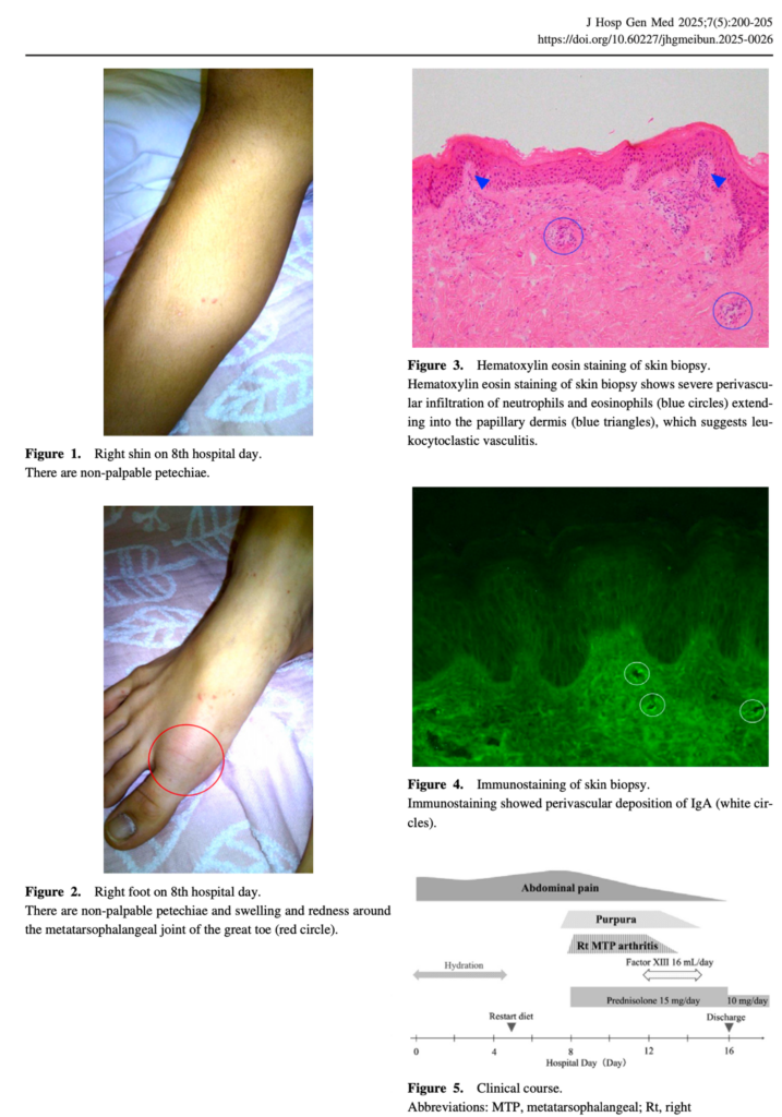 本症例は思春期の女性が腹痛のみで受診したもので、当初は腸炎や婦人科疾患などが疑われました。しかし、入院後に繰り返し行った仮説駆動型身体診察(Hypothesis-driven Physical Examination, HDPE)により、8日目に紫斑や関節炎が出現し、皮膚生検でIgA血管炎と診断が確定しました。