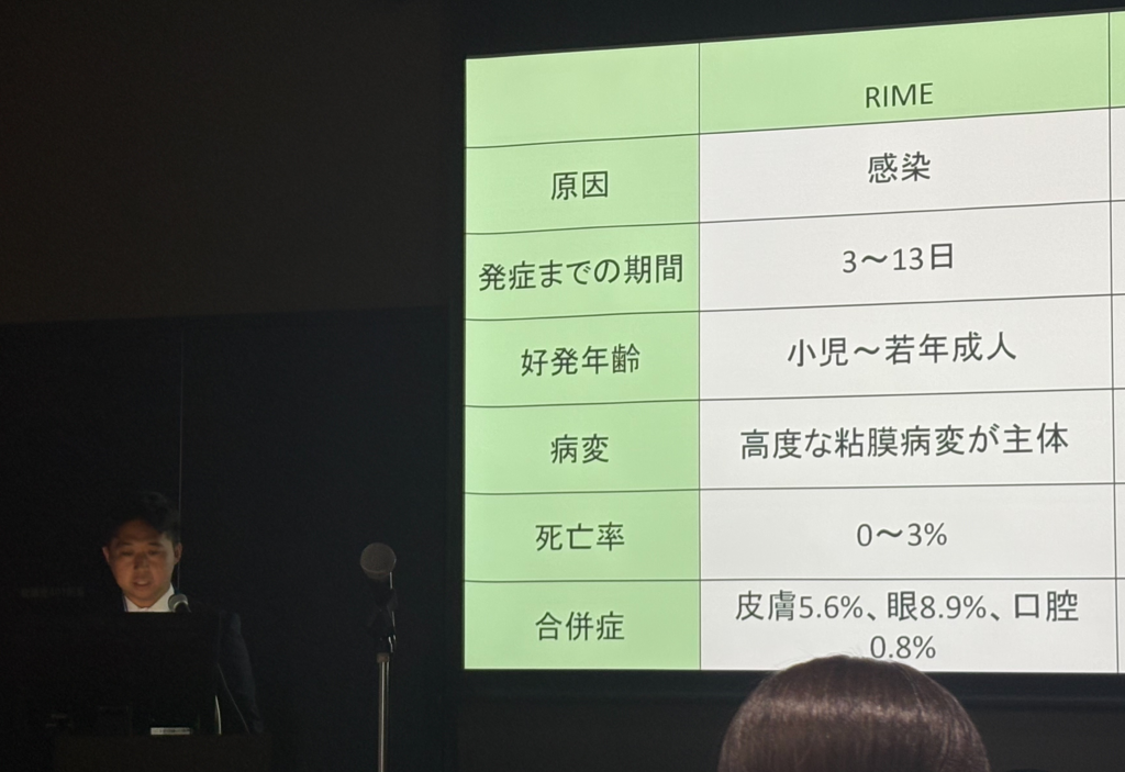 今回が学会デビューとなる研修医1年目の阿部航平先生は、自らが経験した「重度の粘膜症状を呈したマイコプラズマ感染症の一例」を発表してくれました。阿部先生曰く、前日は緊張して眠れなかったとのことですが、発表を見守ってくださった瓜田前教授も繁田先生も阿部先生の堂々たる発表に感嘆しておりました。