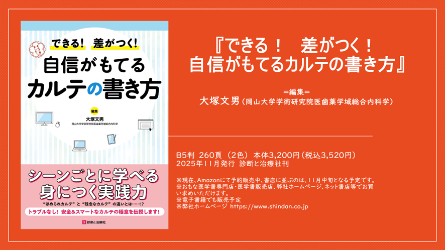 岡山大学総合診療内科の大塚文男先生のご厚意で、研修医・若手医師に向けた書籍『自信がもてるカルテの書き方』で救急外来記録を分担執筆させていただきました。救急外来といっても心肺停止患者などの重症患者だけを見る救命センターではなく、1-2次救急を中心に幅広い疾患・病態の診療を行う内科系救急をイメージして原稿を作成致しました。